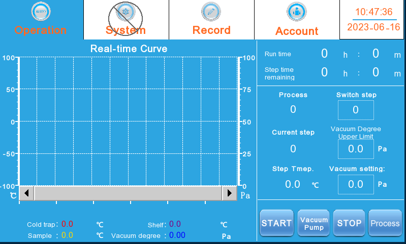 Numeric and curve display of sample temperature, cold trap temperature and chamber vacuum, etc.