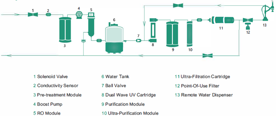 *** Dual wave UV module need to be adopted Also dependent on feed water, recommended feed TOC<30ppb